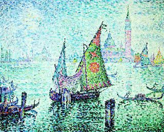 También divisionismo. En pintura, práctica de aplicar pequeñas pinceladas o puntos de color contrastante sobre una superficie a fin de que, desde la distancia aparezcan mezclados.Puntillismo: _La vela ...