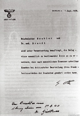 (Mulhouse, Francia , 8-I-1904 — Landsberg am Lech, Baviera, Alemania 2-VI-1948). Médico y criminal de guerra nazi.Alemania. Tercer Reich (1 de septiembre de 1939). Instrucción de Adolf Hitler a los ...