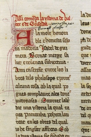 BERNAT METGEPágina inicial de _Valter e Griselda_, traducción al catalán de BERNAT METGE de la epístola latina de Francesco Petrarca _Griseldis_. Lleva una dedicatoria a Isabel de Guimerà. ...