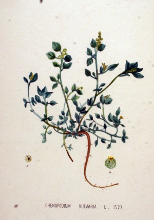 Ilustración de VULVARIA (_Chenopodium vulvaria_)Hierba de la familia de las quenopodiáceas (_Chenopodium vulvaria_). Tiene hojas ovatorrombales, flores inconspicuas, reunidas en racimos axilares, y ...