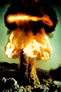 Explosión de una bomba nuclear.(Del latín bombus, ruido sordo.) En alemán, pumbe, bombe; en francés, pompe, bombe; en inglés, pump, bomb; en italiano, pompa, bomba. Proyectil metálico cargado de ...