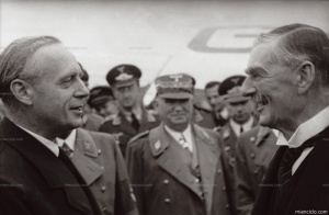 ARTHUR NEVILLE CHAMBERLAIN Conferencia de Munich (1938). Arthur Neville Chamberlain (derecha) y el canciller alemán Joachim von Ribbentrop en el aeropuerto Oberwiesenfeld de Munich.En el centro ...