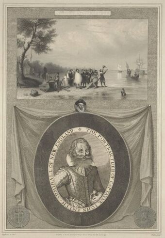 (Willoughby, Lincolnshire, reino de Inglaterra, , bautizado el 6-I-1580 — Londres, reino de Inglaterra, junio de 1631). Explorador británico.Grabado de la llegada a Jamestown, mostrando el retrato ...