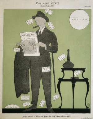 _Der neue Preis_ ("El nuevo precio. ¡Muy actual , sólo el precio está un poco pasado de moda"). Caricatura de Karl Arnold sobre el fenómeno de la hiperinflación y el tipo de cambio entre dólar y marco ...