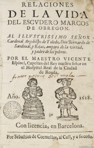 VICENTE ESPINEL_Relaciones de la vida del escudero Marcos de Obregón_, novela picaresca de Vicente Espinel. Edición realizada por Sebastián Comellas en Barcelona (1618). Nombre Vicente Gómez ...