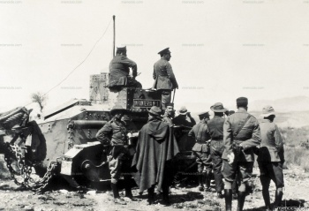 Guerras de Melilla. Los generales Dámaso Berenguer y José Sanjurjo y Sacanell dirigen desde una tanqueta la operación española en Beni-Said (Melilla). Guerras de Melilla. Embarque de tropas hacia ...
