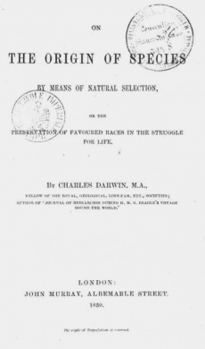 portada de la obra de Darwin El origen de las especies, publicada por primer vez en 1859. En ella Darwin da a conocer las ideas fundamentales del transformismo: evolución adaptativa, selección natural ...