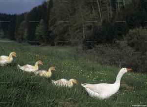 Ganso o Oca (_Anser anser_), del orden ANSERIFORMESOrden de aves acuáticas, de dimensiones variables y cuerpo macizo.El pico de los ANSERIFORMES es ancho y dispone de unas láminas córneas a los lados ...