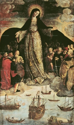 ALEJO FERNÁNDEZ_La Virgen de los Navegantes_ (1536). Óleo sobre tabla de Alejo Fernández. Reales Alcázares de Sevilla. Panel central. Nacimiento ¿?¿Alemania? Fallecimiento h. 1545Sevilla España ...