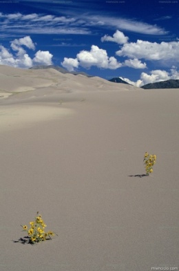 Dos plantas de girasol (_Helianthus annuus_) crecen espontáneamente en una duna de arena. Parque Nacional Great Sand Dunes (Colorado, EE.UU.).Sedimento detrítico incoherente y heterogéneo, formado ...