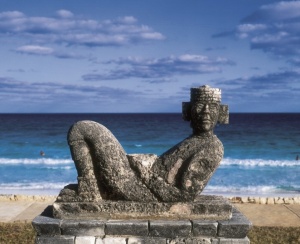 Escultura de Chac-Mool, figura iconográfica característica de la cultura maya que representa una figura humana reclinada sosteniendo un recipiente sobre el vientre. Se la relaciona con ritos ...