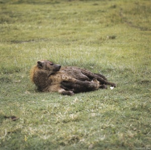 Hiena manchada (_Crocuta crocuta_) amamantando a su críaFamilia de mamíferos carnívoros.Los hiénidos presentan el dorso curvo a causa de que el desarrollo de las extremidades anteriores es mayor que ...