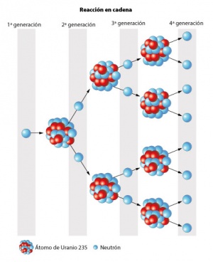 Reacción en cadena en una fisión nuclear.(Del latín _fissio_, _-onis_.) En física nuclear, ruptura de un núcleo pesado en dos o, a veces, tres fragmentos de masas aproximadamente iguales, acompañada ...