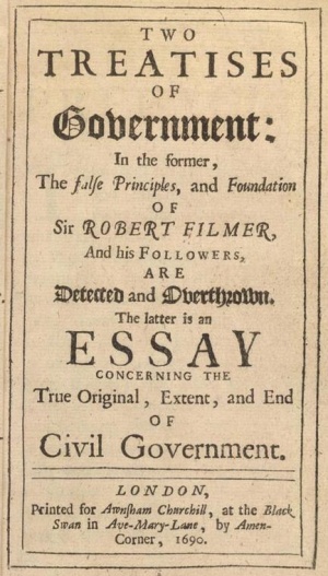 Carátula de la primera edición de _Tratado del Gobierno Civil_, por John Locke.(_Treatises on Government_) Obra del filósofo inglés John Locke. Consta de dos tratados, escritos en 1689 y 1690. Locke ...