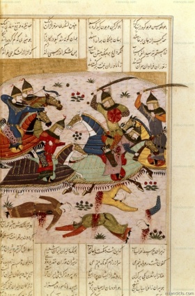 El _Libro de los Reyes_ (Sahl-nama), de Firdusi o Firdawsi (930-1020), impresión del siglo XVI. Miniatura islámica con la representación de una batalla.La literatura persa agrupa el conjunto de ...