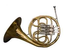 Antiguo CUERNO francés.Instrumento musical de viento de forma curva, por lo común hecho con un cuerno vacío de animal, cuyo sonido se asemeja al de la trompa. Se usaba antiguamente como instrumento ...