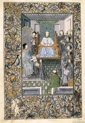 Lengua indoeuropea hablada por los antiguos romanos y que ha dado origen a las lenguas romances._Gramática Latina_, obra escrita para Juan de Zúñiga, Maestre de Alcántara, que aparece escuchando. ...