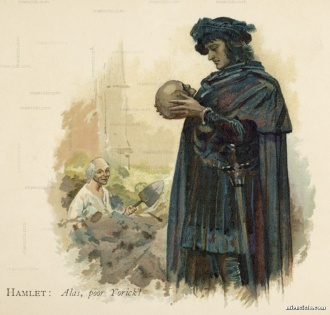 Monólogo de _Hamlet_ (_To be or not to be_: "Ser o no ser"), con el cráneo del bufón _Yorick_. Célebre escena del acto V del _Hamlet_ de William Shakespeare. Ilustración por Walter Paget en _ ...