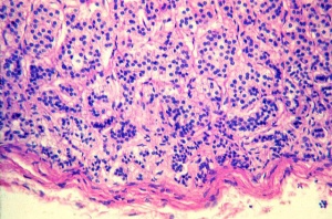 Microfotografía de una glándula suprarrenal en sección transversal.Situado encima de los riñones.■ Dícese de la glándula de secreción interna, par, de forma cónica y aplanada, situada sobre el polo ...