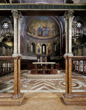 Vista del presbiterio, el altar y el ábside mayor de la catedral románica de Módena (Italia).Área del altar mayor hasta el pie de las gradas por donde se sube a él. Reunión de los presbíteros con el ...