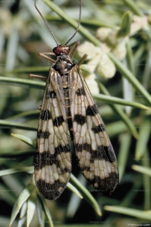 Mosca escorpión (_Panorpa communis_).Familia de insectos del orden mecópteros, de talla mediana, cabeza prolongada en un rostro y cuatro alas semejantes, con manchas negras y nerviación escasa. Las ...