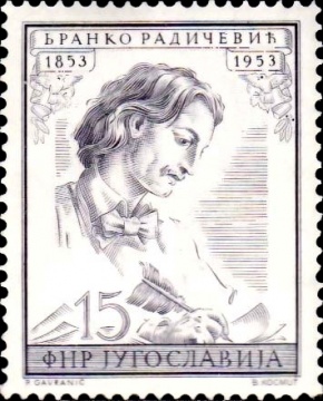 (Slavonski Brod, Eslavonia, Croacia , 1824 — Viena, Imperio austriaco, 1853). Aleksije "Branko" Radičević. Poeta serbio.Sello oficial de la República de Yugoslavia (1953) con la efigie del poeta ...
