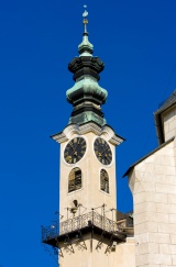 Detalle de la torre del ayuntamiento de la ciudad de Banská Štiavnica.(De ayuntar.) En alemán, _rathaus_; en francés, _hôtel de ville_; en inglés, _townhall_; en italiano, _consiglio comunale_. Acción ...