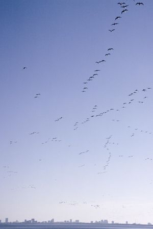 Ganso de Canadá (Branta canadensis). Bandada en migración sobre New JerseyNombre de todas las especies de aves del género Branta, del orden anseriformes, de la familia anátidos.Barnacla canadiense (B ...